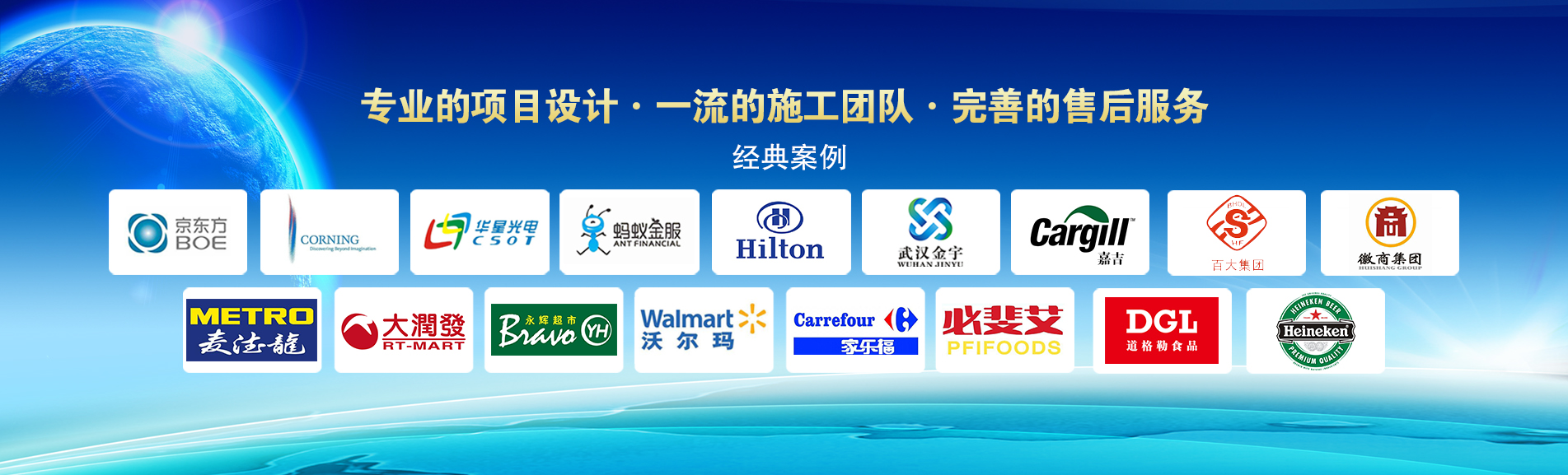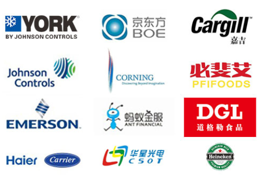 冷凍冷藏設備大型冷庫項目: 武漢中百物流冷庫(40000㎡)、蘇州、北京普洛斯大型物流庫(17000㎡)、沈陽佳德物流冷庫(20000㎡)、上海東航配餐物流庫(6000㎡)、杭州華商勾莊物流冷庫(24000㎡)、安徽安心蔬菜綠色食品冷庫(12000㎡)、武漢金宇冷庫(35000㎡)、必斐艾食品廠(14000㎡)、中國-東盟(百色)農產品交易中心冷庫物流工程(30000㎡)、遵鐵物流冷鏈物流區建設項目中心冷庫物流工程(16500㎡)、長沙云冷產業園冷庫物流工程(21000㎡)等;大型中央空調項目: 武漢康寧顯示玻璃廠廠房、武漢京東方模組廠房、武漢華星光電模組廠房、深圳華星光電模組廠房,杭州阿里巴巴辦公樓,舟山波音737機場辦公樓,南京江北能源站、上海金融大酒店等